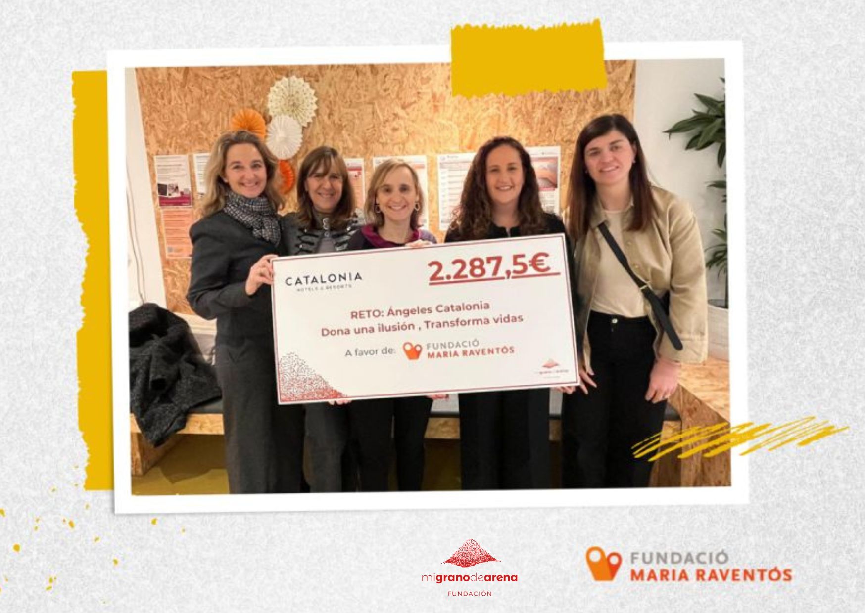 Gràcies a la col·laboració de Catalonia Hotels & Resorts, que ha mobilitzat el seu equip i ha impulsat una campanya solidària a través de la nostra plataforma, s’han recaptat 2.287 € destinats a donar suport a la tasca de la Fundació Maria Raventós. Hem tingut l’honor de fer entrega d’aquesta aportació, que contribuirà directament a reforçar el treball essencial que duu a terme l’entitat.