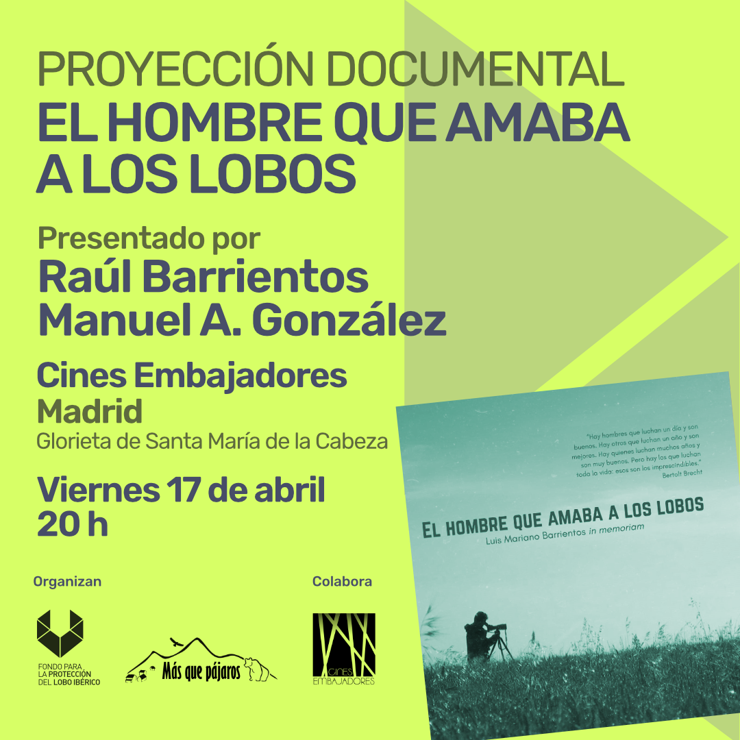 El viernes 17 de abril estaremos en Cines Embajadores, acompañando a la productora Masquepajaros en la presentación en Madrid del documental "El hombre que amaba a los lobos", un homenaje póstumo a Luis Mariano Barrientos, persona de enorme legado en el conservacionismo que dedicó buena parte de su vida a la conservación de los lobos ibéricos.